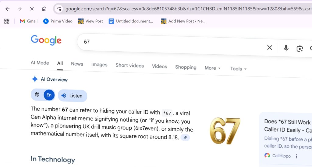 67 या ट्रेंड एक वायरल इंटरनेट मीम है, जिसने सोशल मीडिया से लेकर गूगल तक अपनी जगह बना ली है. जब आप गूगल सर्च बार में 67 या 6-7 टाइप करते हैं, तो सर्च रिजल्ट खुलते ही पूरी स्क्रीन हिलने लगती है. ऐसा लगता है जैसे आपकी स्क्रीन डांस कर रही हो. यह मज़ेदार इफेक्ट मोबाइल और डेस्कटॉप दोनों पर काम करता है.