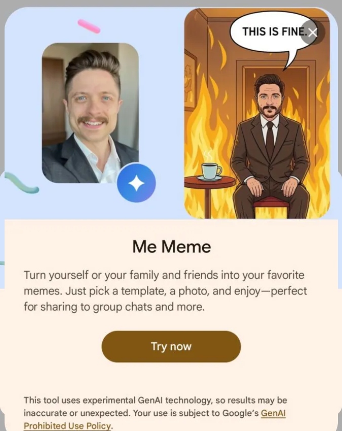 Me Meme рдПрдХ рдЬреЗрдирд░реЗрдЯрд┐рд╡ AI рдмреЗрд╕реНрдб рдлреАрдЪрд░ рд╣реИ, рдЬреЛ рдЖрдкрдХреА рдЪреБрдиреА рд╣реБрдИ рдлреЛрдЯреЛ рдХреЛ рдЕрд▓рдЧ-рдЕрд▓рдЧ рдореАрдо рдЯреЗрдореНрдкрд▓реЗрдЯреНрд╕ рдореЗрдВ рдмрджрд▓ рджреЗрддрд╛ рд╣реИ. Google рдХрд╛ рдХрд╣рдирд╛ рд╣реИ рдХрд┐ рдпрд╣ рдПрдХ тАЬрдлрди рдлреАрдЪрд░тАЭ рд╣реИ, рдЬрд┐рд╕рд╕реЗ рдпреВрдЬрд░реНрд╕ рдордЬреЗрджрд╛рд░, рдкрд░реНрд╕рдирд▓ рдФрд░ рд╢реЗрдпрд░ рдХрд░рдиреЗ рд▓рд╛рдпрдХ рдХрдВрдЯреЗрдВрдЯ рдмрдирд╛ рд╕рдХрддреЗ рд╣реИрдВ. рдпрд╣ рдлреАрдЪрд░ рдЦрд╛рд╕рддреМрд░ рдкрд░ рджреЛрд╕реНрддреЛрдВ рдФрд░ рдлреИрдорд┐рд▓реА рдХреЗ рд╕рд╛рде рд╢реЗрдпрд░ рдХрд░рдиреЗ рдХреЗ рд▓рд┐рдП рдбрд┐рдЬрд╛рдЗрди рдХрд┐рдпрд╛ рдЧрдпрд╛ рд╣реИ.