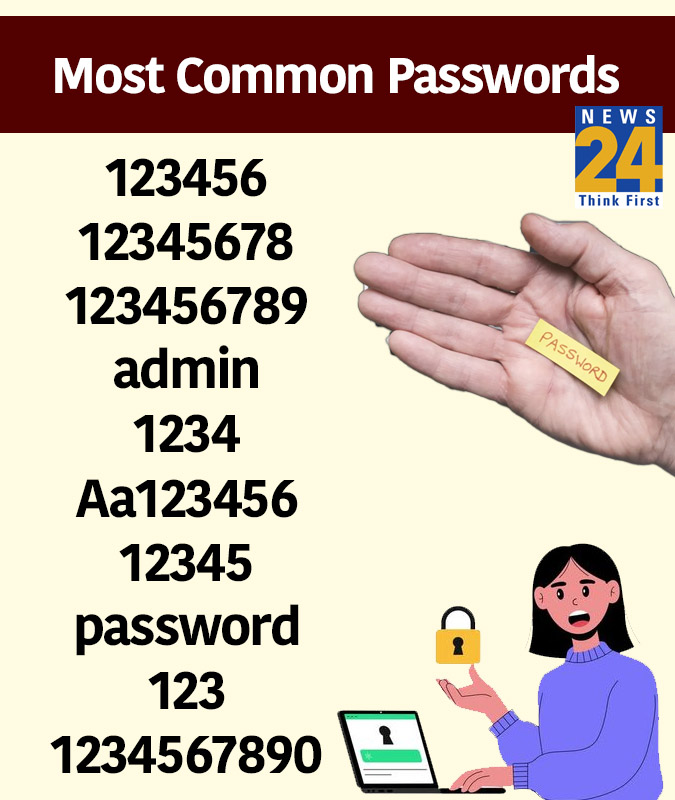 टॉप 10 मोस्ट कॉमन लीक पासवर्ड की लिस्ट में टॉप पर 123456 है, जिसका प्रयोग पासवर्ड के रूप से सबसे ज्यादा बार हुआ. दूसरे नंबर पर 12345678 है, जिसे लाखों यूजर्स ने पासवर्ड बनाया. तीसरे नंबर पर 123456789, चौथे नंबर पर admin, पांचवें नंबर पर 1234, छठे नंबर पर Aa123456, सातवें नंबर पर 12345, आठवें नंबर पर password, नौवें नंबर 123 और 10वें नंबर पर 1234567890 है, इन 10 नंबरों का प्रयोग सबसे कॉमन पासवर्ड में रूप में हुआ.