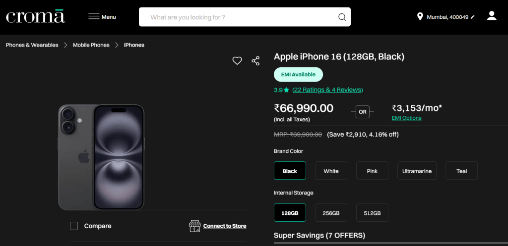Croma ने साल के आखिरी महीने में Cromtastic December Sale शुरू की है, जो 15 दिसंबर से 4 जनवरी तक चलेगी. यह सेल देशभर के सभी Croma स्टोर्स पर लागू है. इसमें स्मार्टफोन से लेकर होम अप्लायंसेज तक कई प्रोडक्ट्स पर छूट दी जा रही है, लेकिन सबसे ज्यादा चर्चा iPhone 16 की डील को लेकर है.