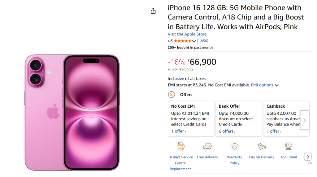 फिलहाल Amazon पर iPhone 16 का 128GB वेरिएंट 66,900 रुपये में लिस्ट किया गया है, जबकि पहले इसकी कीमत 69,900 रुपये थी. इस पर बैंक ऑफर्स जोड़ने के बाद यह और सस्ता हो जाता है. यानी सीधा फायदा उन लोगों को मिल रहा है जो नया iPhone कम कीमत में लेना चाहते हैं.