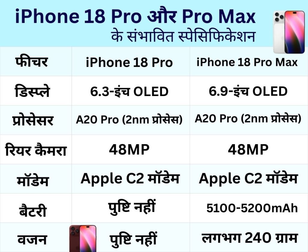 Apple की अगली iPhone 18 Pro सीरीज को लेकर कई नई जानकारियां सामने आ रही हैं. रिपोर्ट्स के मुताबिक iPhone 18 Pro और iPhone 18 Pro Max में नया A20 Pro चिपसेट, अंडर-डिस्प्ले Face ID और सैटेलाइट इंटरनेट सपोर्ट जैसे फीचर्स मिल सकते हैं. जानते हैं इससे जुड़े डिटेल्स.