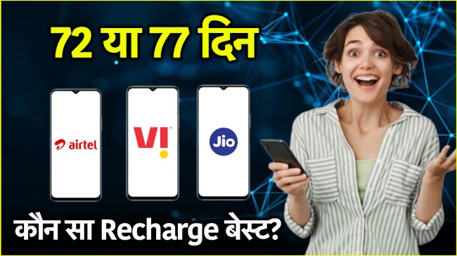 Jio vs Airtel vs Vi Recharge Plans: рд░рд┐рд▓рд╛рдпрдВрд╕ рдЬрд┐рдпреЛ, рдПрдпрд░рдЯреЗрд▓ рдФрд░ рд╡реЛрдбрд╛рдлреЛрди рдЖрдЗрдбрд┐рдпрд╛ рдЬреИрд╕реА 3 рдкреНрд░рд╕рд┐рджреНрдз рдЯреЗрд▓реАрдХреЙрдо рдХрдВрдкрдирд┐рдпрд╛рдВ рд╣реИрдВ рдЬреЛ рдЧреНрд░рд╛рд╣рдХреЛрдВ рдХреЛ рдЕрд▓рдЧ-рдЕрд▓рдЧ рд╡реИрдзрддрд╛ рдФрд░ рдХреАрдордд рдХреЗ рд╕рд╛рде рд░рд┐рдЪрд╛рд░реНрдЬ рдкреНрд▓рд╛рди рдкреЗрд╢ рдХрд░рддреА рд╣реИрдВред рд╕рдмрд╕реЗ рдЬреНрдпрд╛рджрд╛ рдкрд╕рдВрдж рдХрд┐рдП рдЬрд╛рдиреЗ рд╡рд╛рд▓реЗ рд░рд┐рдЪрд╛рд░реНрдЬ рдореЗрдВ 28 рджрд┐рди, 84 рджрд┐рди рдФрд░ 365 рджрд┐рдиреЛрдВ рд╡рд╛рд▓рд╛ рдкреНрд▓рд╛рди рд╢рд╛рдорд┐рд▓ рд╣реИ рд▓реЗрдХрд┐рди рдЕрдЧрд░ рдЖрдк рдЗрддрдиреА рд╡реИрдзрддрд╛ рд╡рд╛рд▓реЗ рдкреНрд▓рд╛рди рдХреЛ рдЕрдкрдирд╛ рдирд╣реАрдВ рдЪрд╛рд╣рддреЗ рд╣реИрдВ рдФрд░ рдЯреЗрд▓реАрдХреЙрдо рдХрдВрдкрдиреА рдХреЗ рдпреВрдирд┐рдХ рд╡реИрдзрддрд╛ рд╡рд╛рд▓реЗ рдкреНрд▓рд╛рдиреЛрдВ рдХреЛ рдЕрдкрдирд╛рдиреЗ рдХреА рд╕реЛрдЪ рд░рд╣реЗ рд╣реИрдВ рддреЛ 72 рджрд┐рди рдФрд░ 77 рджрд┐рдиреЛрдВ рд╡рд╛рд▓реЗ рд░рд┐рдЪрд╛рд░реНрдЬ рдкреНрд▓рд╛рди рдХреЛ рдЪреБрди рд╕рдХрддреЗ рд╣реИрдВред