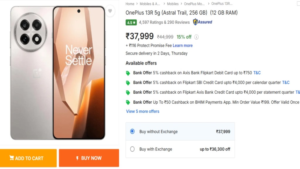 OnePlus 13R को कंपनी ने 42,999 रुपये की शुरुआती कीमत पर लॉन्च किया था. फिलहाल यह फोन फ्लिपकार्ट पर कम दाम में लिस्ट किया गया है. 12GB रैम और 256GB स्टोरेज वेरिएंट की कीमत 37,999 रुपये रखी गई है. इसके अलावा फ्लिपकार्ट Axis बैंक और SBI क्रेडिट कार्ड से पेमेंट करने पर करीब 2,000 रुपये का अतिरिक्त बैंक डिस्काउंट भी मिल रहा है.