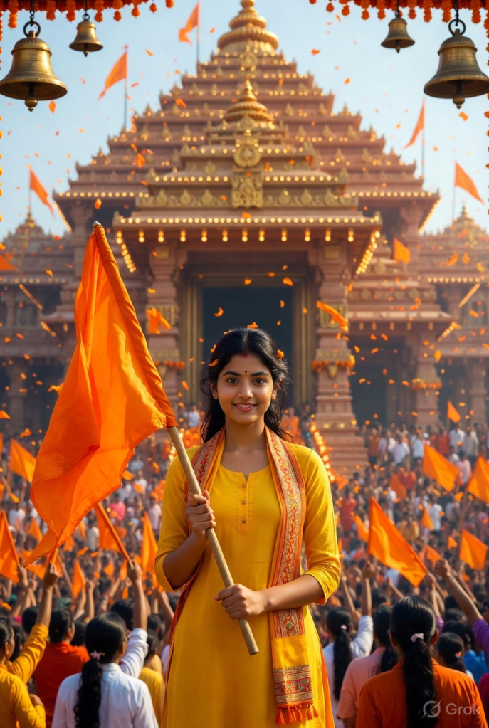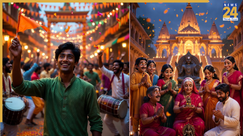 A vibrant cinematic festival portrait of a young Indian man standing in the middle of a colourful celebration while waving a saffron flag. He is wearing a stylish green kurta with traditional patterns and smiling while looking directly at the camera. Around him, people are dancing and playing dhol drums while throwing flower petals into the air. The street is decorated with saffron flags, lights, and festival banners hanging between buildings. In the background, a beautiful temple gate and statue of Lord Ram can be seen glowing under warm evening lights. The camera focuses slightly closer to the man’s face to make him the hero of the scene while the celebration continues behind him. Ultra realistic, cinematic festival atmosphere, vibrant colours, 8K resolution, great detail textures, Take Face From Uploaded image, Keep same 100%.