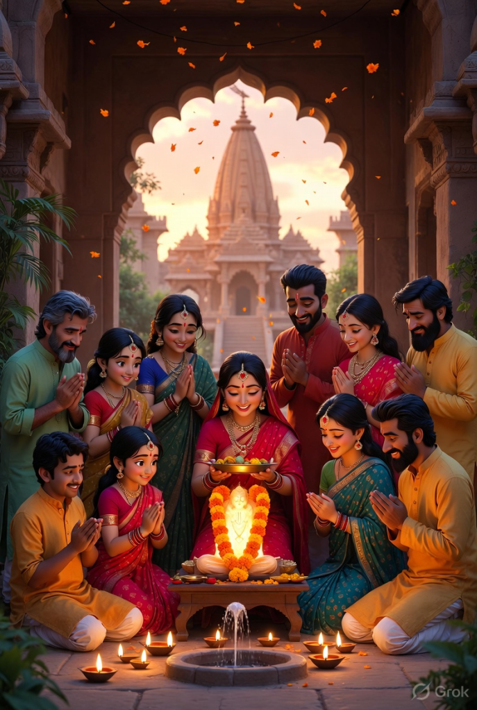 Stunning Pixar-quality 3D animated scene of an Indian Hindu family celebrating Ram Navami 2026- expressive characters, silk sarees and kurtas, family gathered for puja in a haveli courtyard; glowing Ram Lalla idol, diya lighting, marigold petals falling, Ayodhya temple in background, cinematic 8K render