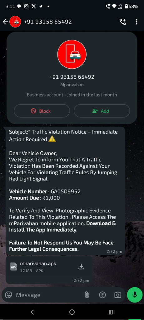टाइम्स ऑफ इंडिया की रिपोर्ट के मुताबिक, हाल ही में RTO Traffic Challan.apk नाम की एक फाइल व्हाट्सऐप पर तेजी से वायरल हो रही है. साइबर सुरक्षा फर्म Cyble Rail का कहना है कि यह एक मालवेयर (हानिकारक सॉफ्टवेयर) है, जो फोन में इंस्टॉल होने के बाद ठगों को आपके डिवाइस तक पूरी पहुंच दे देता है. पिछले एक हफ्ते में ऐसे करीब 10 मामले पुलिस में दर्ज हुए हैं. यह वही ट्रिक है, जो कुछ समय पहले शादी कार्ड के फर्जी मैसेज भेजकर लोगों के फोन हैक करने में इस्तेमाल की गई थी.