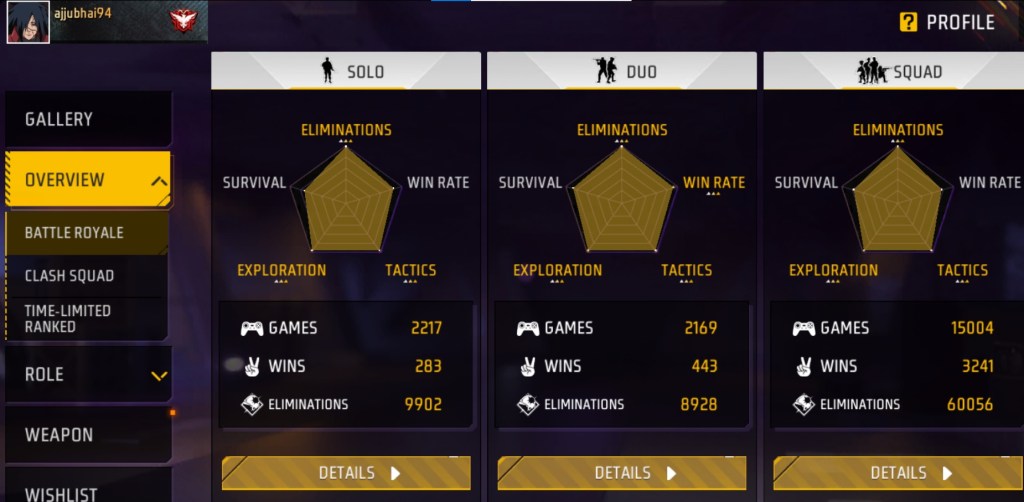 अज्जू भाई की Free Fire MAX ID 451012596 है और वो 76 लेवल पर हैं. उनका IGN Ajjubhai94 है और नीचे उनके करियर बैटल रॉयल स्टैट्स हैं: