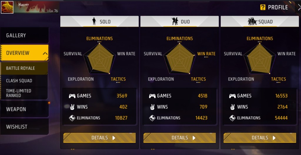 राईस्टार की Free Fire MAX ID 12022250 है और वो 76 लेवल पर हैं. उनका IGN Hacrrr हैं और नीचे उनके करियर बैटल रॉयल स्टैट्स हैं: