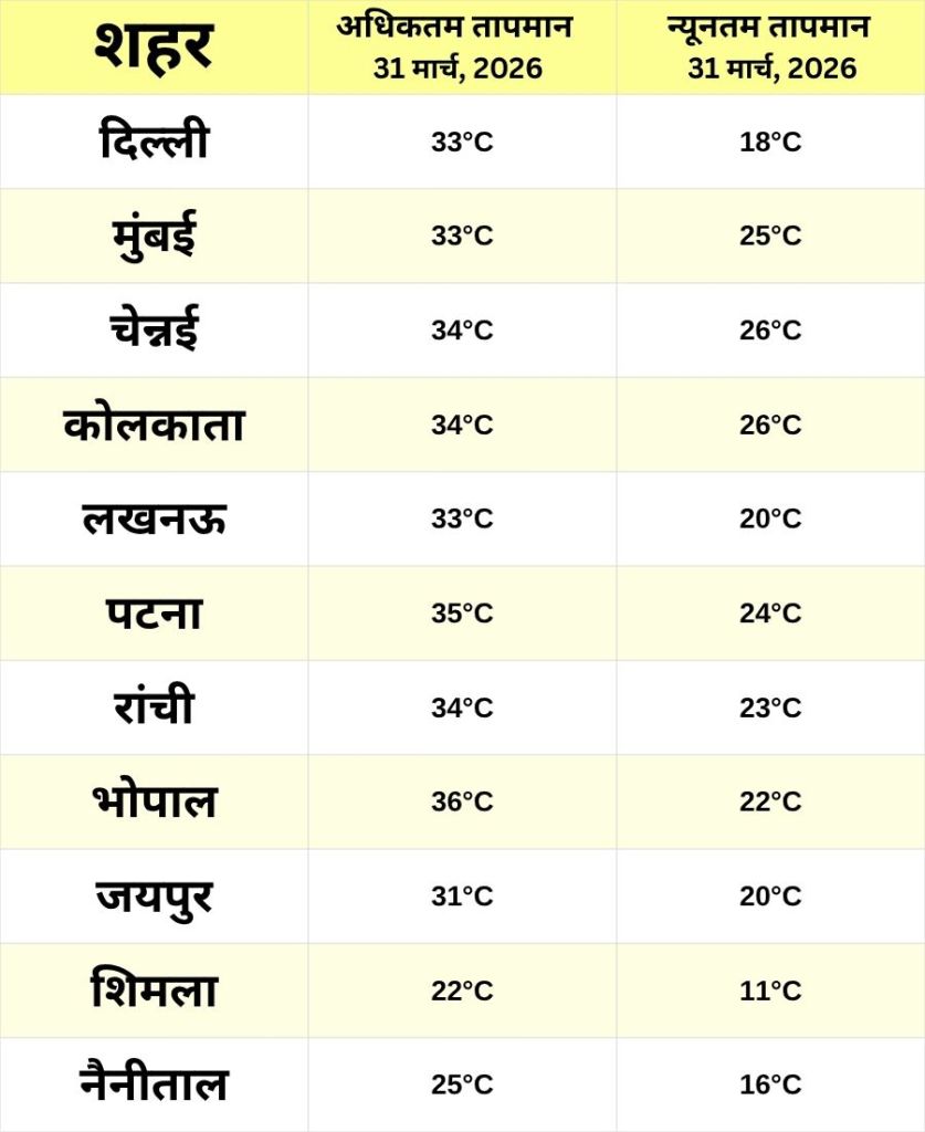 IMD के अनुसार, उत्तर प्रदेश में कुछ जगहों पर बारिश और कुछ जगहों पर गर्मी रहेगी. इस दौरान 30-50 किमी प्रति घंटे की रफ्तार से तेज हवाएं चलेंगी. लखनऊ में 31 मार्च को अधिकतम तापमान 33 डिग्री और न्यूनतम तापमान 20 डिग्री सेल्सियस रहेगा.