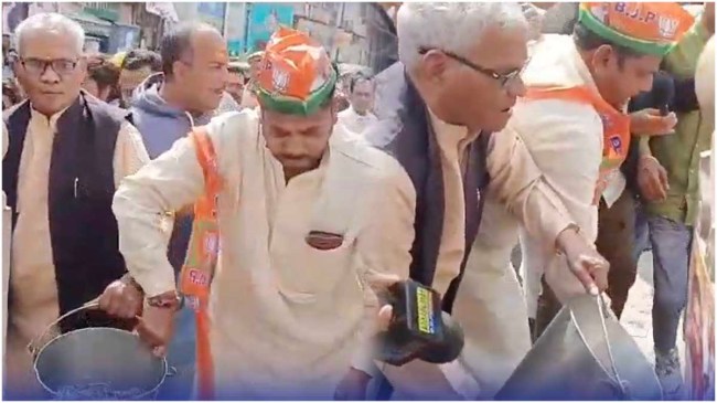 वाराणसी में बीजेपी कार्यकर्ताओं ने राहुल गांधी की न्याय यात्रा निकलने के बाद गोदौलिया के नंदी चौराहे को गंगाजल से धोया। देखें वीडियो….#BharatJodoNyayYatra #Varanasi #RahulGandhi pic.twitter.com/KwGNq5R9Dj