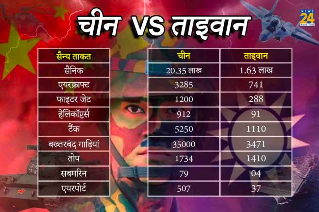 चीन की सेना में एक्टिव सैनिकों की संख्या 20 लाख 35 हजार है। इनमें 9.65 लाख थल सेना, 2.60 लाख नौसेना और 4.14 लाख वायुसेना के जवान शामिल हैं। वहीं, ताइवान के पास सिर्फ 1.63 लाख एक्टिव सैनिक हैं। इनमें 88 हजार थल, 40 हजार नौसेना और 35 हजार वायुसेना के जवान हैं।