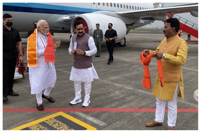 Madhya Pradesh | Prime Minister Narendra Modi landed in Indore, where he was welcomed by Ministers Narottam Mishra, Tulsi Ram Silawat, former Lok Sabha Speaker Sumitra Mahajan and other dignitaries. pic.twitter.com/JldebETKTI