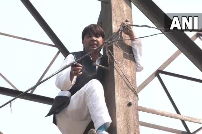 Delhi | Former AAP Councillor Haseeb-ul-Hasan climbs a transmission tower near Shastri Park Metro Station allegedly unhappy over not being given ticket for upcoming MCD poll. Locals, Police and fire brigade are at the spot. pic.twitter.com/e5y7ZxRfeI