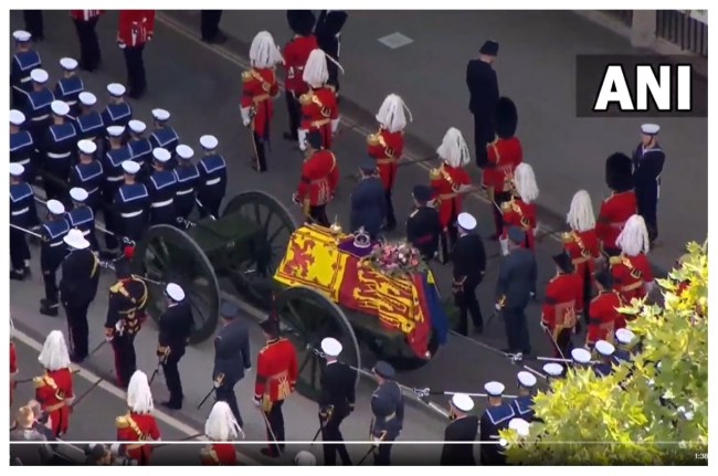 #WATCH | London: Queen Elizabeth II's coffin carried out of the Great West Door through Westminster Abbey; to be now placed back on to the State Gun Carriage ready for the procession from the abbey to Wellington Arch.