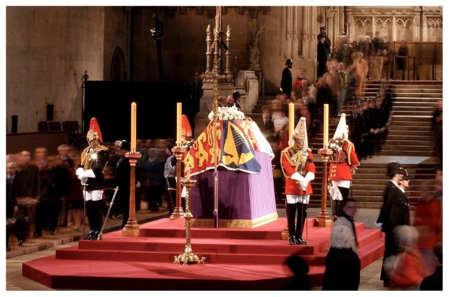 इससे पहले अमेरिकी राष्ट्रपति जो बाइडेन से लेकर फ्रांस के राष्ट्रपति इमैनुएल मैक्रों, भारत के राष्ट्रपति द्रौपदी आदि विश्व के नेता शामिल हुए थे। महारानी के ताबूत वेस्टमिंस्टर एब्बे से ग्रेट वेस्ट डोर से बाहर ले जाया गया था। फिर वेलिंगटन आर्क तक जुलूस के लिए तैयार स्टेट गन कैरिज पर वापस रखा गया। ब्रिटिश प्रधानमंत्री लिज ट्रस जॉन ने प्रार्थना की थी। उन्होंने अपनी प्रार्थना में सुसमाचार के ग्रंथ से दूसरा वचन पढ़ा। जिसमें यीशु मसीह के अपने अनुयायियों को स्वर्ग में एक स्थान की प्रतिज्ञा के बारे में बताते हैं। पूरे ब्रिटेन में इसका लाइव प्रसारण किया गया।