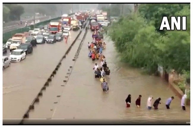 #WATCH | Haryana: Massive traffic jam on Delhi-Gurugram expressway amid severe waterlogging due to incessant rainfall in Gurugram pic.twitter.com/UbaDSflLBv