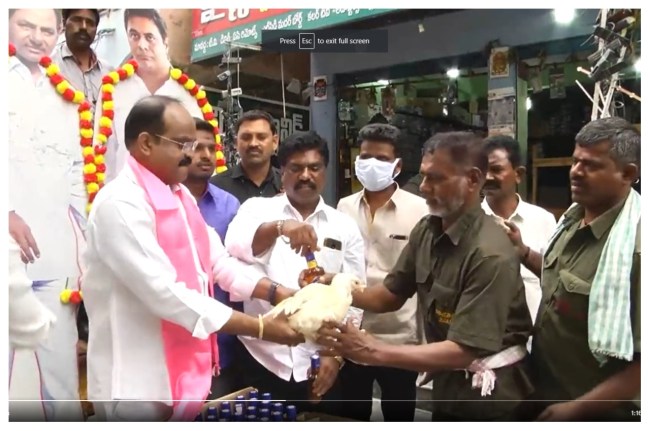 рдЯреАрдПрдорд╕реА рдиреЗрддрд╛ рдиреЗ рддреЗрд▓рдВрдЧрд╛рдирд╛ рд╕реАрдПрдо рдХреЗрд╕реА рд░рд╛рд╡ рдХреА рдмрдбрд╝рд╛ рдХрд╛ рдкреЛрд╕реНрдЯрд░ рд▓рдЧрд╛рдпрд╛ рд╣реБрдЖ рдерд╛ред рдЬрд┐рд╕ рдкрд░ рдорд╛рд▓рд╛ рдЪрдврд╝рд╛рдИ рдереАред рдмреАрдЪ рдмрд╛рдЬрд╛рд░ рдЦрдбрд╝реЗ рд╣реЛрдХрд░ рд╡рд╣ рдЪрд┐рдХрди рд╡ рд╢рд░рд╛рдм рдХреА рдмреЛрддрд▓реЗрдВ рдмрд╛рдВрдЯрддреЗ рдирдЬрд░ рдЖрдПред рд▓реЛрдЧ рд▓рд╛рдЗрди рд▓рдЧрд╛рдХрд░ рдЪрд┐рдХрди рд╡ рд╢рд░рд╛рдм рд▓реЗрддреЗ рдирдЬрд░ рдЖрдПред