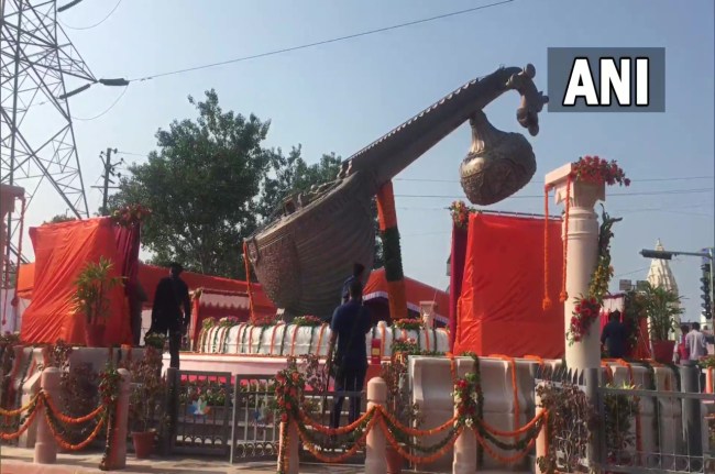 Uttar Pradesh | Visuals from an intersection in Ayodhya which will be inaugurated today as 'Lata Mangeshkar Chowk' by CM Yogi Adityanath, on the late singing maestro's birth anniversary. A Veena weighing 14 tonnes has been installed at the intersection. pic.twitter.com/xd9uyyORqV