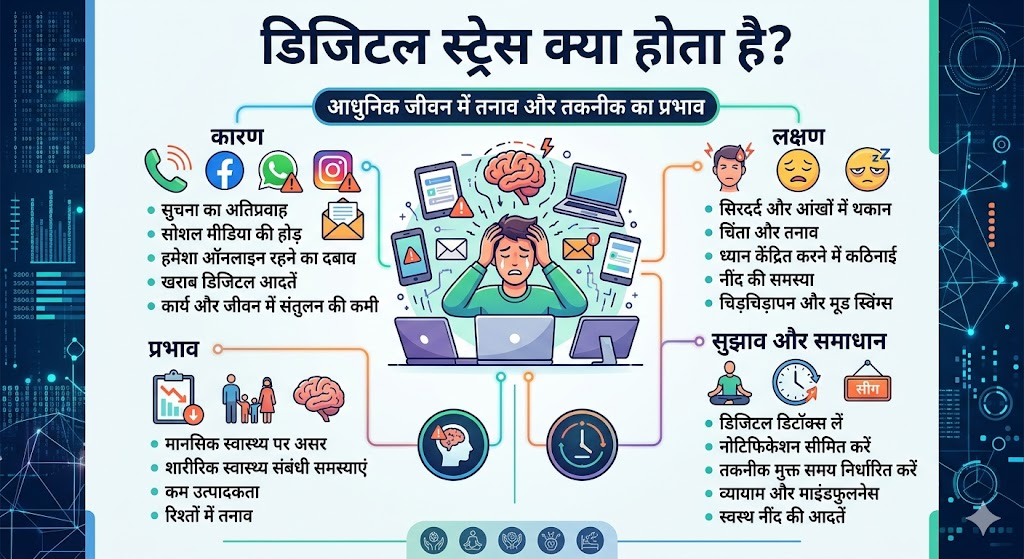 डिजिटल स्ट्रेस लगातार स्क्रीन या डिजिटल डिवाइस इस्तेमाल करने की वजह से हो जाता है. इससे मानसिक और शारीरिक स्तर पर काफी असर पड़ता है, जो लंबे समय तक रहता है.