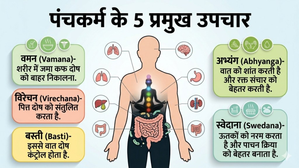 पंचकर्म आयुर्वेद की एक प्राचीन और प्रभावी चिकित्सा पद्धति है, जिसका मुख्य उद्देश्य शरीर से विषैले तत्व (टॉक्सिन्स) निकालकर उसे अंदर से शुद्ध करना होता है. ‘पंचकर्म’ का अर्थ है पांच प्रमुख क्रियाएं, जो शरीर, मन और आत्मा को संतुलित करने में मदद करती हैं. यह उपचार न केवल बीमारियों को दूर करता है बल्कि शरीर की रोग-प्रतिरोधक क्षमता भी बढ़ाता है.