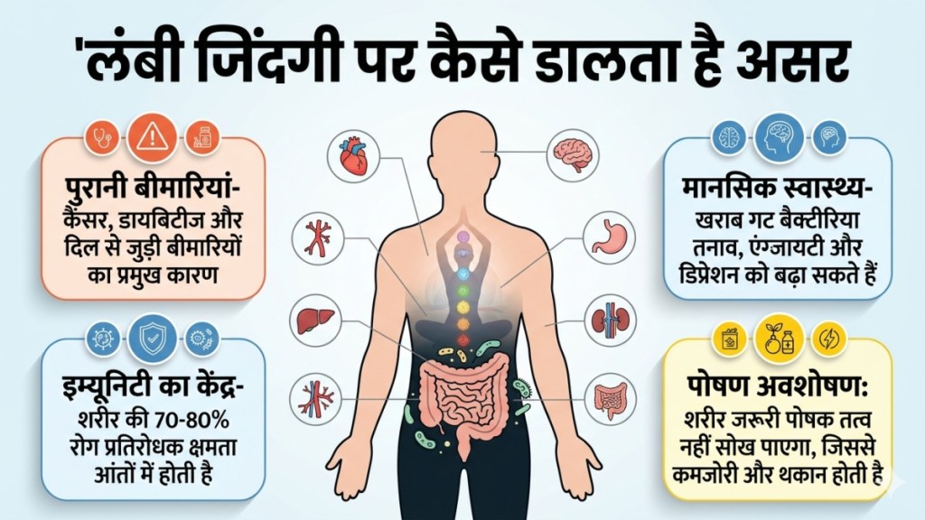 खराब गट हेल्थ से पुरानी सूजन, कम इम्यूनिटी, मोटापा और डिप्रेशन जैसी बीमारियों का खतरा बढ़ता है, जिससे जीवन की गुणवत्ता और अवधि कम हो सकती है.