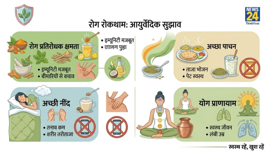 आज जहां बीमारियों ने लोगों जीवन मुश्किल कर दिया है, वहां आयुर्वेद लोगों को जड़ों से मदद कर रहा है. हजारों सालों से लगातार मजबूत उपचार और टिप्स ने आज से पहले कई लोगों की जिंदगी को बेहतर बनाया है. आज विदेश से लोग भारत आते हैं और नेचुरल तरीकों से अपनी समस्याओं को ठीक करते हैं. आयुर्वेद के प्राकृतिक सुझावों का पालन करने से आपकी प्रतिरोधक क्षमता यानी इम्यून सिस्टम मजबूत हो सकता है, पाचन प्रक्रिया बेहतर हो सकती है और ओवर ऑल हेल्थ को बेहतर बनाने में मददगार साबित हो सकता है. आयुर्वेद रोगों से मुक्ति के लिए डेली रूटीन में क्या करना चाहिए, कैसी डाइट होनी चाहिए तमाम चीजों के बारे में बताता है, ताकि खराब लाइफस्टाइल सेहत न बिगड़े.