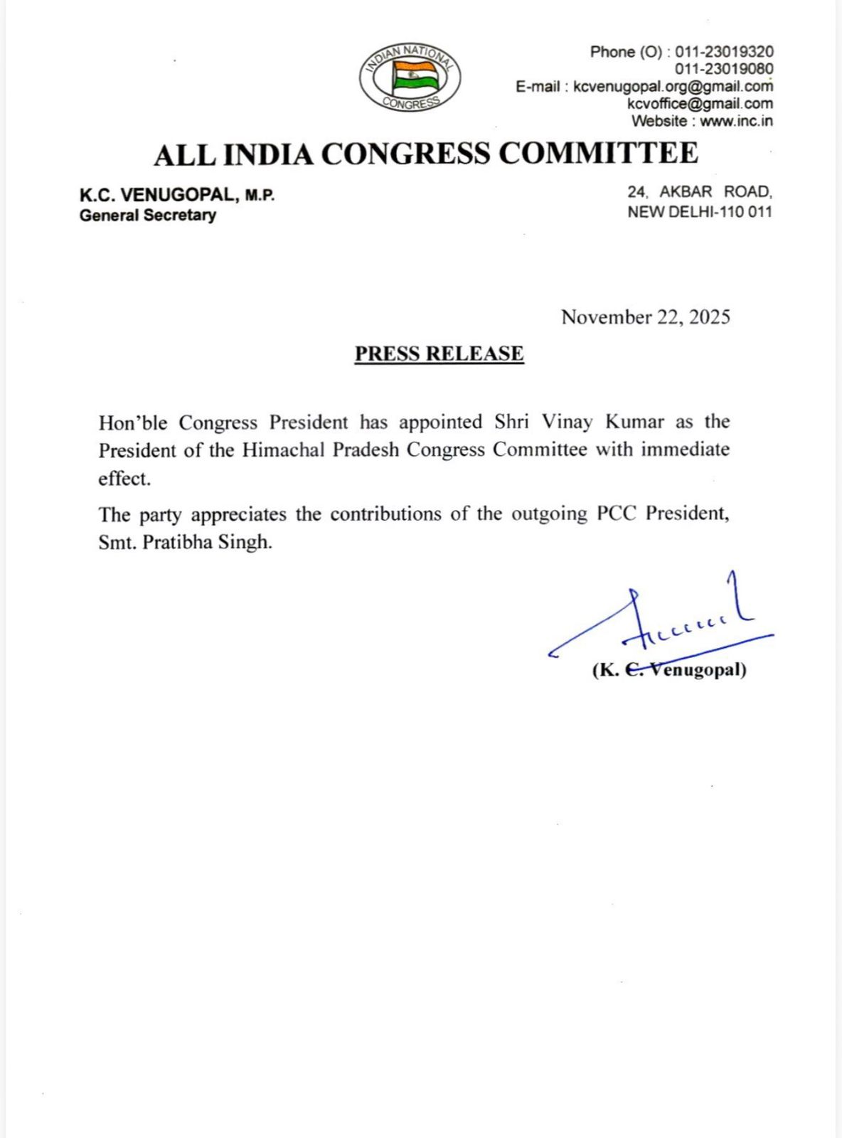 हिमाचल प्रदेश कांग्रेस के नए अध्यक्ष विनय कुमार होंगे. पार्टी आलाकमान ने लंबे मंथन के बाद अनुसूचित जाति से संबंध रखने वाले विनय कुमार के नाम पर सहमति बना ली है. विनय कुमार ने शनिवार को विधानसभा उपाध्यक्ष पद से इस्तीफा दे दिया, जिसे स्पीकर कुलदीप सिंह पठानिया ने मंजूर भी कर लिया. विनय कुमार शिमला संसदीय क्षेत्र के तहत जिला सिरमौर में आने वाली आरक्षित विधानसभा सीट रेणुका से विधायक हैं. करीब एक साल से हिमाचल प्रदेश में कांग्रेस संगठन भंग चल रहा है. प्रतिभा सिंह का बतौर कांग्रेस प्रदेश अध्यक्ष पिछले वर्ष नवंबर महीने में ही तीन साल का कार्यकाल पूरा हो गया था. उसके बाद से उन्हें कार्यवाहक अध्यक्ष नियुक्त किया गया.