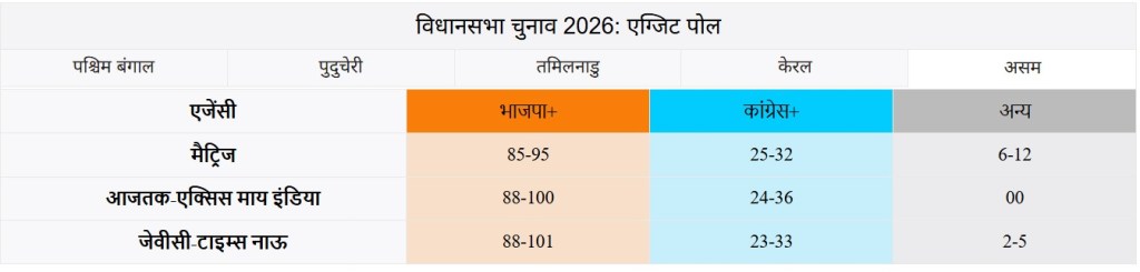 चुनाव नतीजों से पहले आज एग्जिट पोल सामने आने लगे हैं. एग्जिट पोल के जरिए असम की जमीनी स्थिति, वोटिंग ट्रेंड और आंकड़ों के विश्लेषण के साथ संभावित नतीजों की पूरी तस्वीर पेश होगी. सत्ता में वापसी या बदलाव, क्षेत्रीय बनाम राष्ट्रीय दलों का प्रदर्शन और गठबंधन की भूमिका इन सभी सवालों के जवाब एग्जिट पोल में तलाशे जाएंगे.