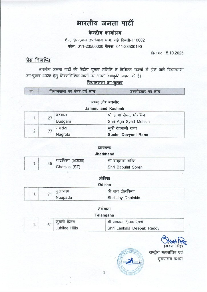 BJP Candidates List: भारतीय जनता पार्टी (BJP) ने जम्मू-कश्मीर, झारखंड, ओडिशा और तेलंगाना में होने वाले विधानसभा उपचुनाव के लिए उम्मीदवारों को सूची जारी कर दी है. 5 सीटों से उम्मीदवारों के नामों का ऐलान किया गया है. जम्मू-कश्मीर की बडगाम सीट से आगा सैयद मोहसिन और नगरोटा सीट से देवयानी राणा को चुनावी रण में उतारा गया है. झारखंड की घाटशिला सीट से बाबूलाल सोरेन और ओडिशा की नुआपाड़ा सीट से जय ढोलकिया को टिकट दिया गया है. वहीं तेलंगाना की जुबली हिल्स सीट से लंकाला दीपक रेड्डी को टिकट दिया गया है.