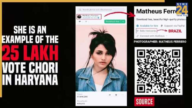 राहुल गांधी ने कहा कि कांग्रेस 22,000 वोटों से चुनाव हार गई। यह महिला कौन है? उन्होंने हरियाणा में 10 अलग-अलग बूथों पर 22 बार वोट डाला। उनके कई नाम हैं। इसका मतलब है कि यह एक केंद्रीकृत ऑपरेशन है। यह महिला एक ब्राजीलियाई मॉडल है। यह एक स्टॉक फोटो है और वह हरियाणा में ऐसे 25 लाख रिकॉर्डों में से एक है।