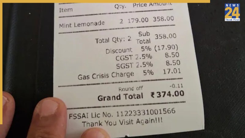 बेंगलुरु के थियो कैफे ने दो मिंट लेमनेड का बिल ग्राहक को दिया, जिसे देखकर ग्राहक भी हैरान रह गया. एक गिलास नींबू पानी की कीमत प्रति ग्लास 179 रुपये है, और 2 ग्लास का टोटल 358 रुपये बनता है. लेकिन बिल में 5 प्रतिशत ‘गैस क्राइसिस चार्ज’ 17.01 रुपये भी जोड़ा गया, जिसमें अन्य चार्ज जोड़कर टोटल कीमत 374 रुपये हो गई. यह विवादास्पद शुल्क तब जुड़ा जब देश के कुछ हिस्सों में एलपीजी गैस की आपूर्ति में कमी की खबरें सामने आ रही हैं.