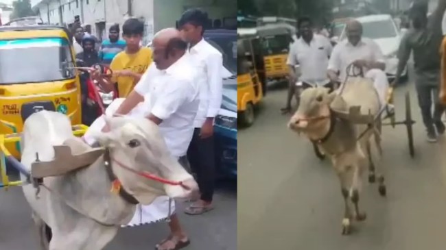 #WATCH | Chennai: AIADMK Senior leader and former Tamil Nadu Minister D Jayakumar rode a bullock cart in Vannarapettai, to condemn the DMK government's delay in fulfilling poll promise to give fuel subsidy. (05.11)