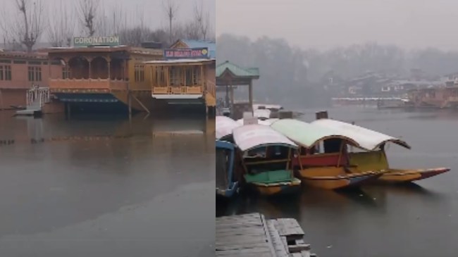 VIDEO | Thin layer of ice forms over Dal Lake in Srinagar as temperature dips in Jammu and Kashmir. pic.twitter.com/pUAfjLimHT