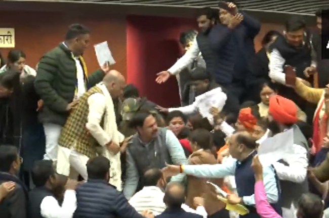 #WATCH | Delhi: Ruckus at Civic Center as BJP, AAP councillors clash with each other amid ensuing sloganeering ahead of Delhi Mayor polls. pic.twitter.com/v1HXUxawSC