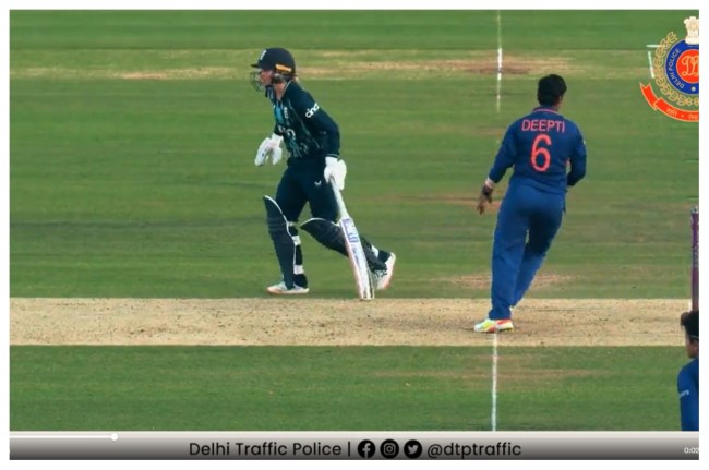 नई दिल्ली: दिल्ली ट्रैफिक पुलिस ने रविवार को दीप्ति शर्मा की ‘Mankading’घटना पर चुटकी ली और अपने ट्वीट में ‘ड्राइविंग के दौरान सतर्कता’ बरतने का संदेश दिया। दिल्ली ट्रैफिक पुलिस ने रविवार को ट्वीट किया, “क्यों सतर्कता महत्वपूर्ण है। बता दें कि Mankading का मतलब है कि जब नॉन-स्ट्राइकर के छोर पर बल्लेबाज अपनी क्रीज छोड़ देता और गेंदबाज बॉल डिलीवरी से आउट कर दे। वह कानूनी रूप से ऐसा कर सकता है।