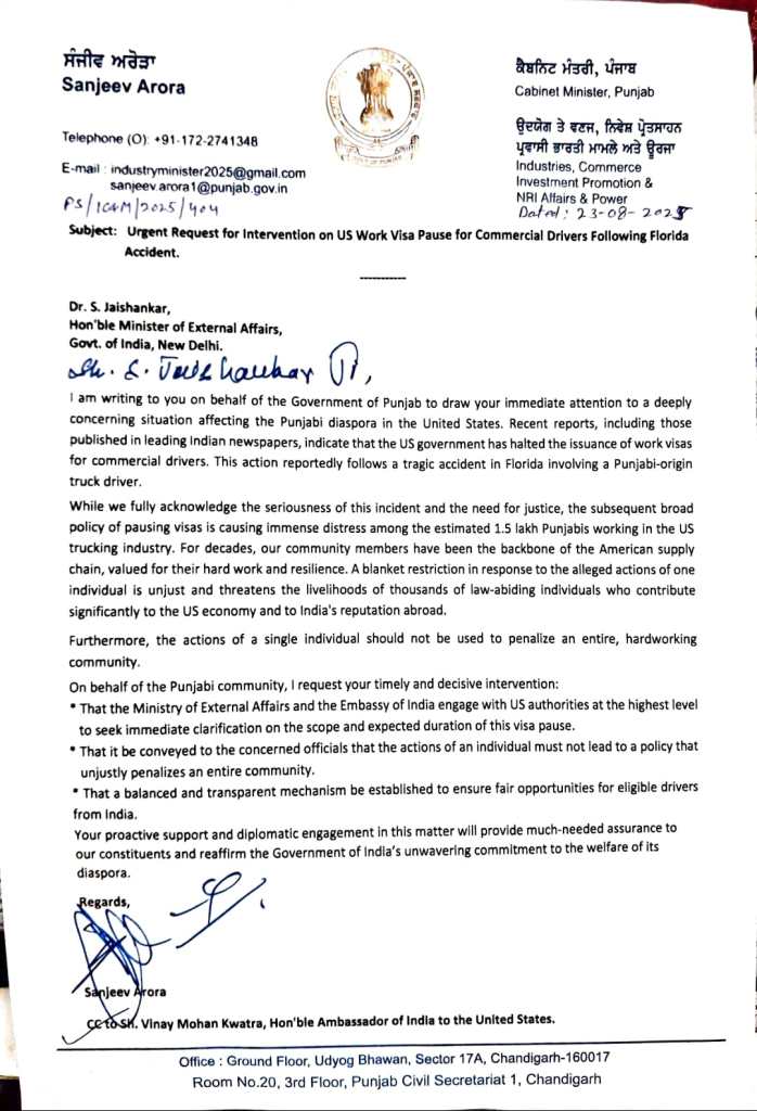 उन्होंने चिट्ठी में लिखा कि फ्लोरिडा में पंजाबी मूल के ट्रक ड्राइवर द्वारा किए गए हादसे के बाद अमेरिका ने कमर्शियल ड्राइवरों के वर्क वीजा रोक दिए। इससे 1.5 लाख पंजाबी ड्राइवरों की रोजी-रोटी पर संकट मंडरा गया है। विदेश मंत्रालय और भारतीय दूतावास को अमेरिकी सरकार से तुरंत बातचीत करके वीजा बहाल कराना चाहिए। एक घटना के आधार पर पूरी पंजाबी कम्युनिटी को सजा देना गलत है।
