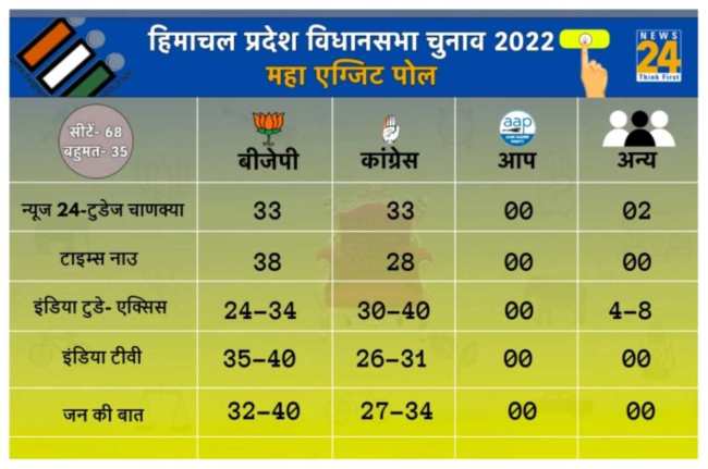 рдПрдХреНрдЬрд┐рдЯ рдкреЛрд▓ рдХреЗ рдЕрдиреБрдорд╛рди рдХреЗ рдЕрдиреБрд╕рд╛рд░ рд╣рд┐рдорд╛рдЪрд▓ рдореЗрдВ рдмреАрдЬреЗрдкреА рдХреА рд╕рддреНрддрд╛ рдЬрд╛рддреА рджрд┐рдЦ рд░рд╣реА рд╣реИред рдХрд╛рдВрдЧреНрд░реЗрд╕ рдордЬрдмреВрддреА рд╕реЗ 5 рд╕рд╛рд▓ рдХреЗ рдмрд╛рдж рд╡рд╛рдкрд╕реА рдХрд░рддреА рджрд┐рдЦ рд░рд╣реА рд╣реИред рдиреНрдпреВрдЬ24-рдЯреБрдбреЗрдЬ рдЪрд╛рдгрдХреНрдпрд╛ рдХреЗ рдПрдирд╛рд▓рд┐рд╕рд┐рд╕ рдореЗрдВ рднрд╛рдЬрдкрд╛ рдФрд░ рдХрд╛рдВрдЧреНрд░реЗрд╕ рдХреЛ 33-33 рд╕реАрдЯреЗрдВ, рдЕрдиреНрдп рдХреЛ 02 рд╕реАрдЯреЗрдВ рдорд┐рд▓рдиреЗ рдХреЗ рдЕрдиреБрдорд╛рди рд╣реИрдВред рдЗрдВрдбрд┐рдпрд╛ рдиреНрдпреВрдЬ-рдЬрди рдХреА рдмрд╛рдд рдХреА рдПрдХреНрдЬрд┐рдЯ рдкреЛрд▓ рдореЗрдВ 32-40 рд╕реАрдЯреЗрдВ рднрд╛рд░рддреАрдп рдЬрдирддрд╛ рдкрд╛рд░реНрдЯреА рдХреЛ рдорд┐рд▓рдиреЗ рдХрд╛ рдЕрдиреБрдорд╛рди рд╣реИред рдХрд╛рдВрдЧреНрд░реЗрд╕ рдХреЛ 27-34, рдЖрдо рдЖрджрдореА рдкрд╛рд░реНрдЯреА рдХреЛ 0 рдФрд░ рдЕрдиреНрдп рдХреЛ 1-2 рд╕реАрдЯреЗрдВ рдорд┐рд▓рдиреЗ рдХрд╛ рдЕрдиреБрдорд╛рди рдмрддрд╛рдпрд╛ рдЬрд╛ рд░рд╣рд╛ рд╣реИред