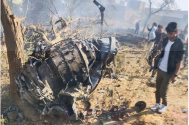 #WATCH | Rajasthan, Bharatpur | Wreckage of jet seen. Earlier report as confirmed by Bharatpur District Collector Alok Ranjan said charter jet, however, defence sources confirm IAF jets have crashed in the vicinity. Therefore, more details awaited. pic.twitter.com/005oPmUp6Z