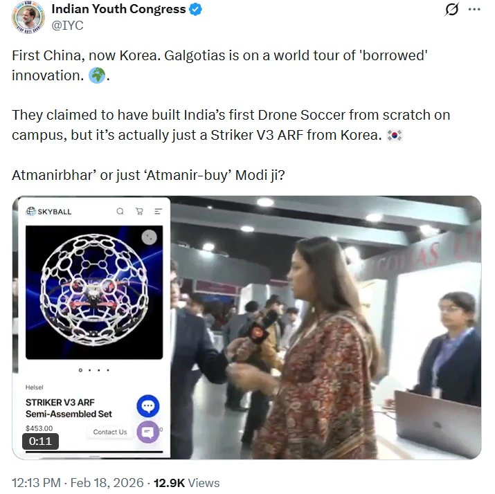 рдпреВрде рдХрд╛рдВрдЧреНрд░реЗрд╕ рдиреЗ рдЯреНрд╡реАрдЯ рдХрд┐рдпрд╛, 'рдкрд╣рд▓реЗ рдЪреАрди, рдЕрдм рдХреЛрд░рд┐рдпрд╛. рдЧрд▓рдЧреЛрдЯрд┐рдпрд╛ 'рдЙрдзрд╛рд░' рд▓рд┐рдП рдЧрдП рдЗрдиреЛрд╡реЗрд╢рди рдХреЗ рд╡рд░реНрд▓реНрдб рдЯреВрд░ рдкрд░ рд╣реИрдВ. рдЙрдиреНрд╣реЛрдВрдиреЗ рдХреИрдВрдкрд╕ рдореЗрдВ рд╕реНрдХреНрд░реИрдЪ рд╕реЗ рднрд╛рд░рдд рдХрд╛ рдкрд╣рд▓рд╛ рдбреНрд░реЛрди рд╕реЙрдХрд░ рдмрдирд╛рдиреЗ рдХрд╛ рджрд╛рд╡рд╛ рдХрд┐рдпрд╛, рд▓реЗрдХрд┐рди рдЕрд╕рд▓ рдореЗрдВ рдпрд╣ рдХреЛрд░рд┐рдпрд╛ рдХрд╛ рд╕реНрдЯреНрд░рд╛рдЗрдХрд░ V3 ARF рд╣реИ. рдЖрддреНрдордирд┐рд░реНрднрд░ рдпрд╛ рд╕рд┐рд░реНрдл 'рдЖрддреНрдордирд┐рд░реНрднрд░-рдЦрд░реАрджреЗ' рдореЛрджреА рдЬреА?'