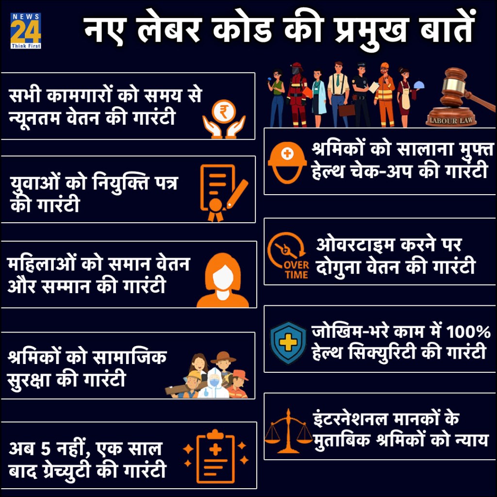 New Labour Codes: рднрд╛рд░рдд рдореЗрдВ рдХрд░реЛрдбрд╝реЛрдВ рдХрд░реНрдордЪрд╛рд░рд┐рдпреЛрдВ рдХреЗ рд▓рд┐рдП рдмреАрддреЗ рд╢реБрдХреНрд░рд╡рд╛рд░ рдХреЗрдВрджреНрд░ рд╕рд░рдХрд╛рд░ рдиреЗ рдмрдбрд╝реА рд░рд╛рд╣рдд рджреЗрддреЗ рд╣реБрдП рд╢реНрд░рдо рдХрд╛рдиреВрдиреЛрдВ рдореЗрдВ рдХрдИ рдЕрд╣рдо рдмрджрд▓рд╛рд╡ рдХрд┐рдП. рдирдП рд╢реНрд░рдо рдХрд╛рдиреВрдиреЛрдВ рдореЗрдВ рдХрд░реНрдордЪрд╛рд░рд┐рдпреЛрдВ рдХреЛ рдорд┐рд▓рдиреЗ рд╡рд╛рд▓реА рд╕реИрд▓рд░реА, рдЧреНрд░реЗрдЪреНрдпреВрдЯреА рдХреЗ рд╕рд╛рде-рд╕рд╛рде рдЙрдирдХреЗ рдУрд╡рд░рдЯрд╛рдЗрдо, рдирд╛рдЗрдЯ рд╢рд┐рдлреНрдЯ, рдЫрдВрдЯрдиреА рдЬреИрд╕реЗ рдХрдИ рдореБрджреНрджреЛрдВ рдкрд░ рдЙрдиреНрд╣реЗрдВ рдмрдбрд╝реА рд░рд╛рд╣рдд рджреА рд╣реИ. рд╕рд░рдХрд╛рд░ рдиреЗ рдмрд┐рдЦрд░реЗ рдкрдбрд╝реЗ 29 рдХрд╛рдиреВрдиреЛрдВ рдХреЛ рдЕрдм 4 рдирдП рд▓реЗрдмрд░ рдХреЛрд░реНрдб рдореЗрдВ рдорд░реНрдЬ рдХрд░ рджрд┐рдпрд╛ рд╣реИ. рд╢реБрдХреНрд░рд╡рд╛рд░ (21 рдирд╡рдВрдмрд░) рдХреЛ рд╢реНрд░рдо рдХрд╛рдиреВрди рдордВрддреНрд░реА рдбреЙ. рдордирд╕реБрдЦ рдорд╛рдВрдбрд┐рдпрд╛ рдиреЗ рд▓реЗрдмрд░ рдХреЛрдб рдореЗрдВ рд╣реБрдП рдмрджрд▓рд╛рд╡ рдХреА рдЬрд╛рдирдХрд╛рд░реА рджреЗрддреЗ рд╣реБрдП рдмрддрд╛рдпрд╛ рдХрд┐ рджреЗрд╢ рдореЗрдВ рдЕрдм рдирдИ рд╢реНрд░рдо рд╕рдВрд╣рд┐рддрд╛рдПрдВ рд▓рд╛рдЧреВ рд╣реЛ рдЧрдИрдВ рд╣реИрдВ.