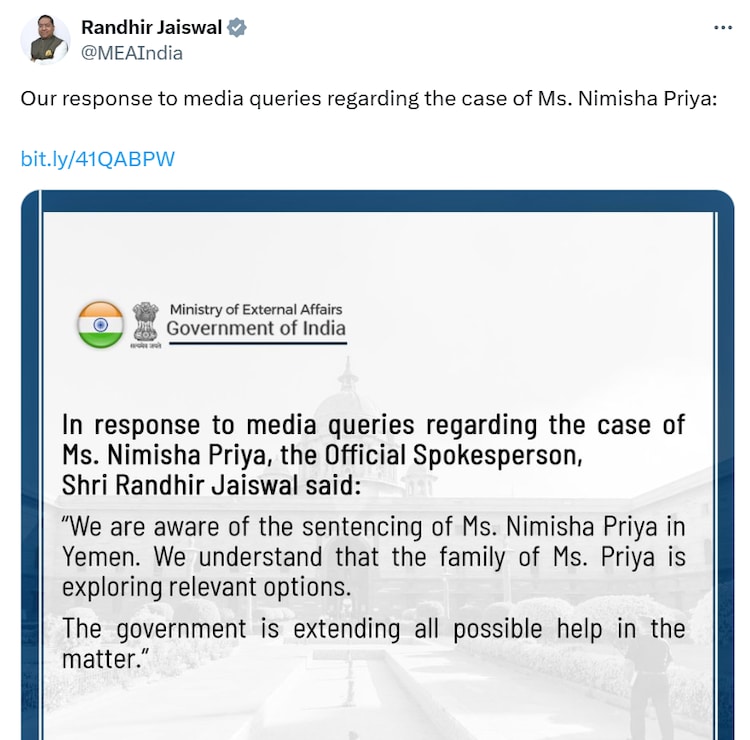 मामले को लेकर विदेश मंत्रालय ने कहा हमें निमिषा प्रिया मामले की पूरी जानकारी है। विदेश मंत्रालय के प्रवक्ता ने कहा प्रिया का परिवार कई विकल्प तलाश कर रहा है, हम उनकी मदद कर रहे हैं। हम उन्हें हर कानूनी मदद मुहैया कराएंगे। निमिषा प्रिया 2017 से यमन की जेल में बंद है। वह नौकरी के लिए यमन गई थी।