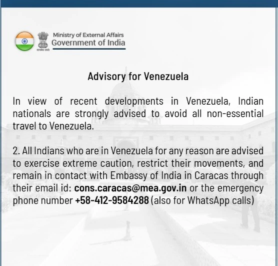 рднрд╛рд░рдд рд╕рд░рдХрд╛рд░ рдиреЗ рд╡реЗрдиреЗрдЬреБрдПрд▓рд╛ рдХреЗ рд▓рд┐рдП рдЬрд╛рд░реА рдХреА рдЧрдИ рдПрдбрд╡рд╛рдЗрдЬрд░реА рдореЗрдВ рдХрд╣рд╛ рд╣реИ рдХрд┐ рд░рд╛рдЬрдиреАрддрд┐рдХ рдЕрд╕реНрдерд┐рд░рддрд╛ рдХреЛ рджреЗрдЦрддреЗ рд╣реБрдП рдЧреИрд░-рдЬрд░реВрд░реА рдпрд╛рддреНрд░рд╛ рд╕реЗ рдмрдЪреЗрдВ, рд╡рд╣рд╛рдВ рдореМрдЬреВрдж рднрд╛рд░рддреАрдп рдЕрддреНрдпрдзрд┐рдХ рд╕рд╛рд╡рдзрд╛рдиреА рдмрд░рддреЗрдВ. рд╕рд╛рде рд╣реА рдмрд╛рд╣рд░ рдЖрдирд╛-рдЬрд╛рдирд╛ рдХрдо рдХрд░реЗрдВ рдФрд░ рдХрд╛рд░рд╛рдХрд╛рд╕ рд╕реНрдерд┐рдд рднрд╛рд░рддреАрдп рджреВрддрд╛рд╡рд╛рд╕ рдХреЗ рд╕рдВрдкрд░реНрдХ рдореЗрдВ рд░рд╣реЗрдВ.