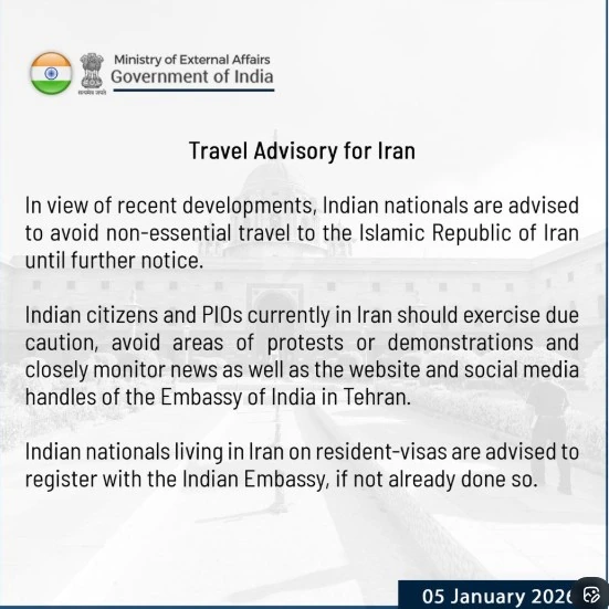 рдЕрдкрдиреЗ рдЖрдзрд┐рдХрд╛рд░рд┐рдХ рдмрдпрд╛рди рдореЗрдВ MEA рдиреЗ рднрд╛рд░рддреАрдп рдирд╛рдЧрд░рд┐рдХреЛрдВ рд╕реЗ рдХрд╣рд╛ рдХрд┐ ‘рд╡реЗ рдЕрдЧрд▓реЗ рдЖрджреЗрд╢ рддрдХ рдИрд░рд╛рди рдХреА рдЧреИрд░-рдЬрд░реВрд░реА рдпрд╛рддреНрд░рд╛ рд╕реЗ рдмрдЪреЗрдВ. рд╕рд╛рде рд╣реА рдИрд░рд╛рди рдореЗрдВ рдореМрдЬреВрдж рднрд╛рд░рддреАрдп рджреВрддрд╛рд╡рд╛рд╕ рдХреЗ рд╕рдВрдкрд░реНрдХ рдореЗрдВ рд░рд╣реЗрдВ. рдЗрд╕рдХреЗ рдЕрд▓рд╛рд╡рд╛ рдИрд░рд╛рди рд╕реЗ рдЬреБрдбрд╝реА рдЦрдмрд░реЛрдВ, рд╡реЗрдмрд╕рд╛рдЗрдЯреНрд╕ рдФрд░ рд╕реЛрд╢рд▓ рдореАрдбрд┐рдпрд╛ рдкрд░ рднреА рдирдЬрд░ рд░рдЦреЗрдВ рдЬрд┐рд╕рд╕реЗ рдЖрдкрдХреЛ рдЕрдкрдбреЗрдЯреНрд╕ рдорд┐рд▓рддреЗ рд░рд╣реЗ.’