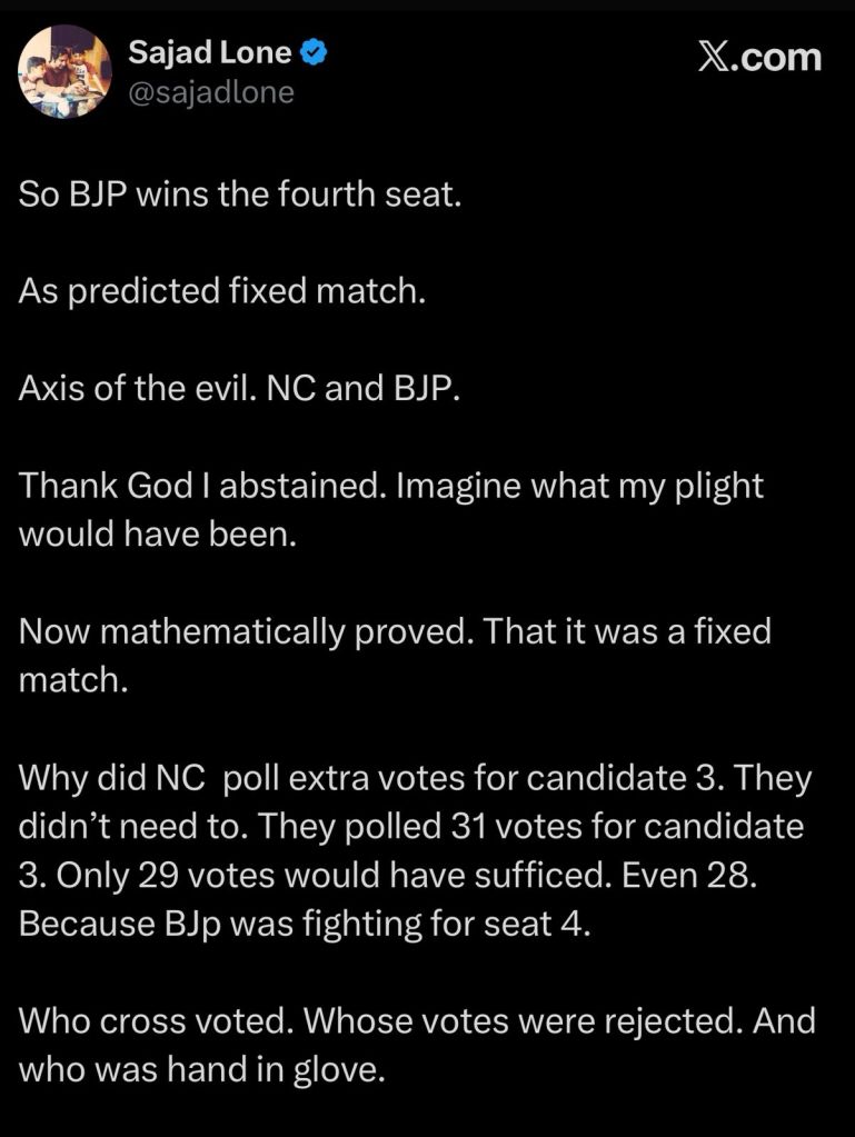 वहीं चुनावी नतीजों के बाद पीपुल्स कॉन्फ्रेंस के सज्जाद लोन ने सोशल मीडिया X पर पोस्ट करते हुए लिखा कि ‘तो भाजपा चौथी सीट जीत गई. जैसी कि भविष्यवाणी की गई थी, फिक्स मैच. बुराई की धुरी. नेशनल कॉन्फ्रेंस और भाजपा. शुक्र है कि मैंने मतदान नहीं किया. सोचिए मेरी क्या हालत होती. अब गणितीय रूप से सिद्ध हो गया है. कि यह एक फिक्स मैच था. नेशनल कॉन्फ्रेंस ने उम्मीदवार 3 के लिए अतिरिक्त वोट क्यों डाले? उन्हें इसकी ज़रूरत नहीं थी. उन्होंने उम्मीदवार 3 के लिए 31 वोट डाले. केवल 29 वोट ही काफी होते. यहाँ तक कि 28 भी. क्योंकि भाजपा सीट 4 के लिए लड़ रही थी. किसने क्रॉस वोट किया. किसके वोट खारिज हुए और किसकी मिलीभगत थी’.