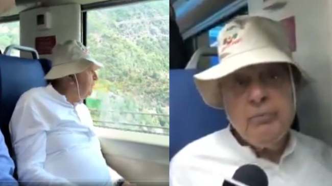 #WATCH | Srinagar, J&K: National Conference chief Farooq Abdullah travels on the Vande Bharat train from Nowgam Railway Station to Katra.