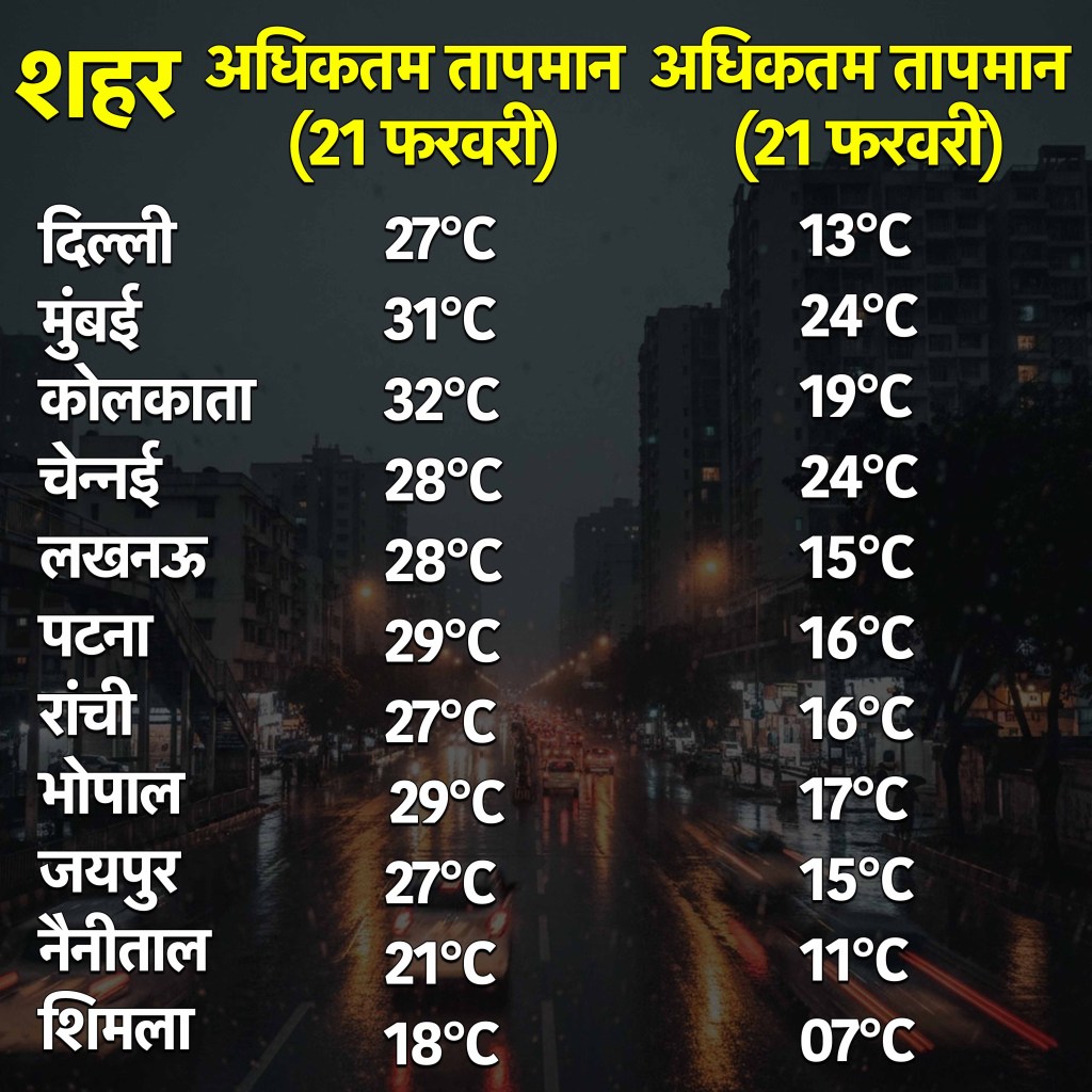 23 और 24 फरवरी को छत्तीसगढ़ और ओडिशा में बारिश की पूरी संभावना है. 21 और 22 फरवरी को तमिलनाडु और केरल में गरज के साथ 35 से 45 किलोमीटर प्रति घंटे की रफ्तार वाली तेज हवाओं के झोंके साथ भारी बारिश की संभावना है.