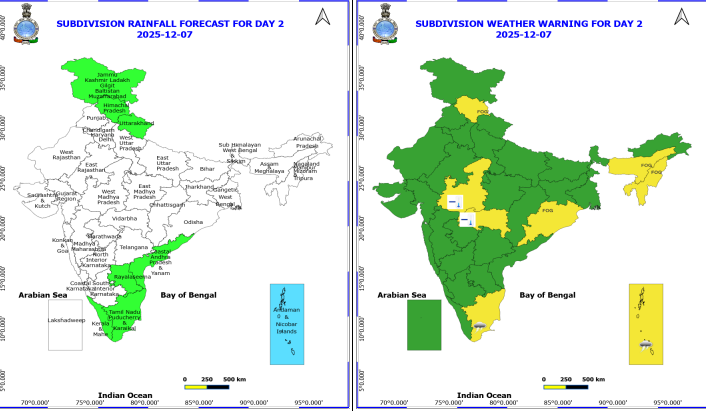 рднрд╛рд░рдд рдХреЗ рдореМрд╕рдо рд╡рд┐рдЬреНрдЮрд╛рди рд╡рд┐рднрд╛рдЧ рдХреЗ рдЕрдиреБрд╕рд╛рд░ рдЬрдореНрдореВ-рдХрд╢реНрдореАрд░-рд▓рджреНрджрд╛рдЦ-рдЧрд┐рд▓рдЧрд┐рдд-рдмрд╛рд▓реНрдЯрд┐рд╕реНрддрд╛рди-рдореБрдЬрд╝рдлрд╝реНрдлрд╝рд░рд╛рдмрд╛рдж рдФрд░ рдЙрддреНрддрд░рд╛рдЦрдВрдб рдореЗрдВ 07 рдФрд░ 08 рддрд╛рд░реАрдЦ рдХреЛ рдФрд░ рд╣рд┐рдорд╛рдЪрд▓ рдкреНрд░рджреЗрд╢ рдореЗрдВ 07 рджрд┐рд╕рдВрдмрд░ рдХреЛ рд╣рд▓реНрдХреА, рдордзреНрдпрдо рдЫрд┐рдЯрдкреБрдЯ рдмрд╛рд░рд┐рд╢ рдФрд░ рдкрд╣рд╛рдбрд╝реА рдХреНрд╖реЗрддреНрд░реЛрдВ рдореЗрдВ рдмрд░реНрдлрд╝рдмрд╛рд░реА рд╣реЛрдиреЗ рдХреА рдмрд╣реБрдд рд╕рдВрднрд╛рд╡рдирд╛ рд╣реИ. рддрдорд┐рд▓рдирд╛рдбреБ рдореЗрдВ 06 рдФрд░ 07 рддрд╛рд░реАрдЦ рдХреЛ рдФрд░ рд▓рдХреНрд╖рджреНрд╡реАрдк рдореЗрдВ 06 рджрд┐рд╕рдВрдмрд░ рдХреЛ рдЕрд▓рдЧ-рдЕрд▓рдЧ рдЬрдЧрд╣реЛрдВ рдкрд░ рдЧрд░рдЬ-рдЪрдордХ рдХреЗ рд╕рд╛рде рд╣рд▓реНрдХреА рд╕реЗ рдордзреНрдпрдо рдмрд╛рд░рд┐рд╢ рд╣реЛрдиреЗ рдХреА рд╕рдВрднрд╛рд╡рдирд╛ рд╣реИ. рдЕрдВрдбрдорд╛рди рдФрд░ рдирд┐рдХреЛрдмрд╛рд░ рджреНрд╡реАрдк рд╕рдореВрд╣ рдореЗрдВ 07 рджрд┐рд╕рдВрдмрд░ рдХреЛ рдХрдИ рдЬрдЧрд╣реЛрдВ рдкрд░ рдЧрд░рдЬ-рдЪрдордХ, рдмрд┐рдЬрд▓реА рдФрд░ рддреЗрдЬрд╝ рд╣рд╡рд╛рдУрдВ рдХреЗ рд╕рд╛рде рд╣рд▓реНрдХреА рд╕реЗ рдордзреНрдпрдо рдмрд╛рд░рд┐рд╢ рд╣реЛрдиреЗ рдХреА рдмрд╣реБрдд рд╕рдВрднрд╛рд╡рдирд╛ рд╣реИ.