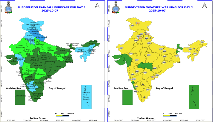 рдЖрдИрдПрдордбреА рдХреЗ рдкреВрд░реНрд╡рд╛рдиреБрдорд╛рди рдХреЗ рдореБрддрд╛рдмрд┐рдХ рдЕрд╕рдо рдФрд░ рдореЗрдШрд╛рд▓рдп, рд╣рд┐рдорд╛рдЪрд▓ рдкреНрд░рджреЗрд╢, рдирд╛рдЧрд╛рд▓реИрдВрдб, рдордгрд┐рдкреБрд░, рдорд┐рдЬрд╝реЛрд░рдо рдФрд░ рддреНрд░рд┐рдкреБрд░рд╛, рд░рд╛рдпрд▓рд╕реАрдорд╛, рддрдорд┐рд▓рдирд╛рдбреБ, рдкреБрдбреБрдЪреЗрд░реА рдФрд░ рдХрд░рд╛рдИрдХрд▓ рдФрд░ рдЙрддреНрддрд░рд╛рдЦрдВрдб рдореЗрдВ рдЕрд▓рдЧ-рдЕрд▓рдЧ рд╕реНрдерд╛рдиреЛрдВ рдкрд░ рднрд╛рд░реА рд╡рд░реНрд╖рд╛ рдХреА рд╕рдВрднрд╛рд╡рдирд╛ рд╣реИ. рдЕрд░реБрдгрд╛рдЪрд▓ рдкреНрд░рджреЗрд╢, рдЕрд╕рдо рдФрд░ рдореЗрдШрд╛рд▓рдп, рдмрд┐рд╣рд╛рд░, рдЫрддреНрддреАрд╕рдЧрдврд╝, рдкреВрд░реНрд╡реА рд░рд╛рдЬрд╕реНрдерд╛рди, рдЭрд╛рд░рдЦрдВрдб, рдХреЗрд░рд▓ рдФрд░ рдорд╛рд╣реЗ, рдХреЛрдВрдХрдг рдФрд░ рдЧреЛрд╡рд╛, рдордзреНрдп рдорд╣рд╛рд░рд╛рд╖реНрдЯреНрд░, рдордзреНрдп рдкреНрд░рджреЗрд╢, рдорд░рд╛рдард╡рд╛рдбрд╝рд╛, рдирд╛рдЧрд╛рд▓реИрдВрдб, рдордгрд┐рдкреБрд░, рдорд┐рдЬреЛрд░рдо рдФрд░ рддреНрд░рд┐рдкреБрд░рд╛, рдУрдбрд┐рд╢рд╛, рддрдорд┐рд▓рдирд╛рдбреБ, рдкреБрдбреБрдЪреЗрд░реА рдФрд░ рдХрд░рд╛рдИрдХрд▓, рддреЗрд▓рдВрдЧрд╛рдирд╛ рдФрд░ рдЙрддреНрддрд░ рдкреНрд░рджреЗрд╢ рдореЗрдВ рдЕрд▓рдЧ-рдЕрд▓рдЧ рд╕реНрдерд╛рдиреЛрдВ рдкрд░ рдЧрд░рдЬ рдХреЗ рд╕рд╛рде рдмрд┐рдЬрд▓реА рдЧрд┐рд░рдиреЗ рдХреА рд╕рдВрднрд╛рд╡рдирд╛ рд╣реИ.