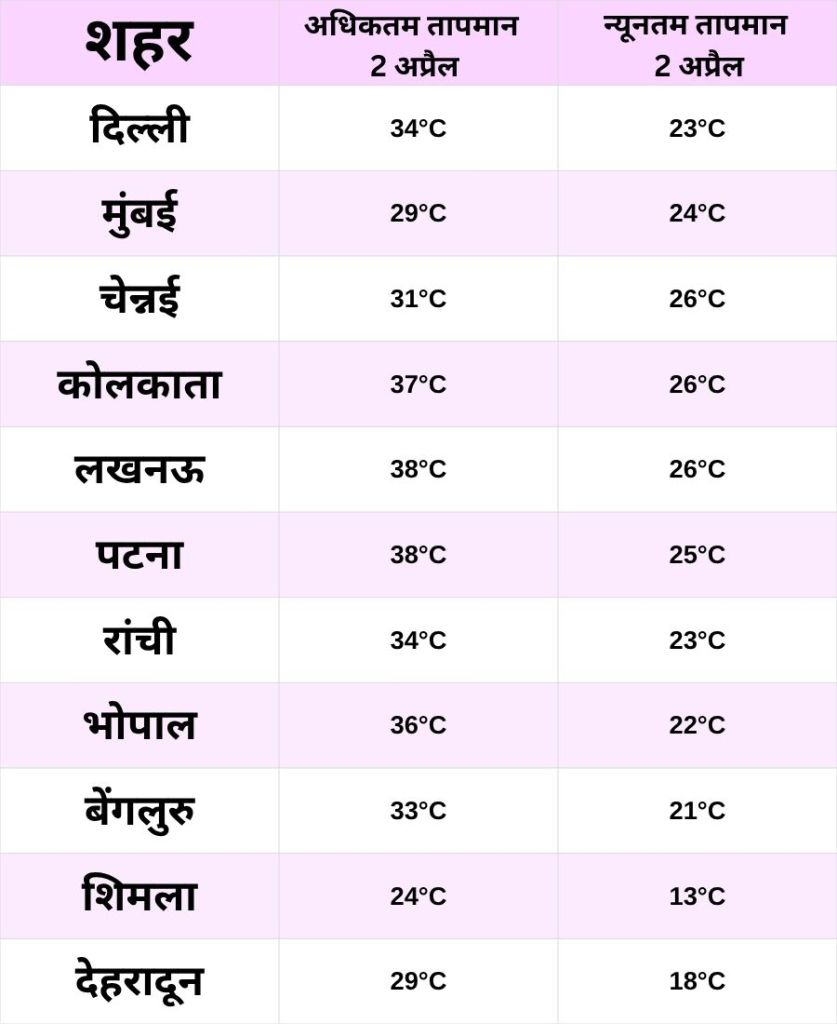 Kal Ka Mausam 2 April: рдЕрдкреНрд░реИрд▓ рдорд╣реАрдиреЗ рдХреА рд╢реБрд░реВрдЖрдд рд╣реЛ рдЪреБрдХреА рд╣реИ. рдЗрд╕рдХреЗ рд╕рд╛рде рд╣реА IMD рдиреЗ рдЕрдкреНрд░реИрд▓ рдХреА рд╢реБрд░реБрдЖрдд рдореЗрдВ рд╣реА рджреЗрд╢ рдХреЗ 11 рд░рд╛рдЬреНрдпреЛрдВ рдореЗрдВ рдмрд╛рд░рд┐рд╢ рд╣реЛрдиреЗ рдХреА рдЪреЗрддрд╛рд╡рдиреА рдЬрд╛рд░реА рдХреА рд╣реИ. рдореМрд╕рдо рд╡рд┐рднрд╛рдЧ рдХреЗ рдЕрдиреБрд╕рд╛рд░, рджрд┐рд▓реНрд▓реА, рдЙрддреНрддрд░ рдкреНрд░рджреЗрд╢, рдмрд┐рд╣рд╛рд░, рдЙрддреНрддрд░рд╛рдЦрдВрдб, рд░рд╛рдЬрд╕реНрдерд╛рди рдФрд░ рдордзреНрдп рдкреНрд░рджреЗрд╢ рд╕рд╣рд┐рдд 11 рд░рд╛рдЬреНрдпреЛрдВ рдореЗрдВ рддреВрдлрд╛рдиреА рдмрд╛рд░рд┐рд╢ рджреЗрдЦрдиреЗ рдХреЛ рдорд┐рд▓ рд╕рдХрддреА рд╣реИ. рдЗрд╕ рджреМрд░рд╛рди рд╣рд╡рд╛ рдХреА рдЧрддрд┐ 70 рдХрд┐рд▓реЛрдореАрдЯрд░ рдкреНрд░рддрд┐ рдШрдВрдЯреЗ рддрдХ рдкрд╣реБрдВрдЪ рд╕рдХрддреА рд╣реИ.